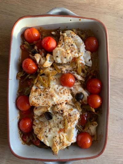 Kabeljauw met snijbonen, tomaatjes en zwarte olijven uit de oven