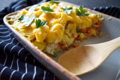 Kabeljauw in romige saus met doperwt en wortel uit de oven