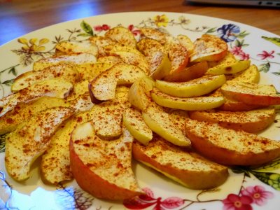 Verwarm de oven voor op 200 ˚C. Snijd de appeltjes in partjes en verdeel over een met bakpapier beklede ovenplaat. Strooi kaneel over elk appel partje en zet 20 minuten in de voorverwarmde oven.
