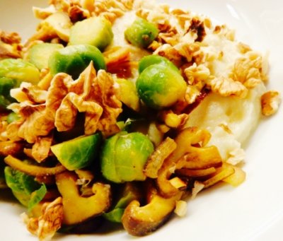 Knolselderij-peerpuree met kerriespruitjes en walnoten