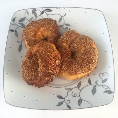 Scheid de eidooiers van de eiwit. Bewaar het eiwit apart in een schaal. Doe het eigeel met de melk, zonnebloemolie, bakpoeder, zout en volkorenbloem in een kom en kneed deze tot er een egale massa ontstaat. Maak twee deegsliertsen en vlecht deze door elkaar. Maak er vervolgens mooie, ronde ringen van. Pak de schaal met het eiwit en doe in een andere aparte schaal het sesamzaad. Dus nu heb je 2 schalen: 1 met eiwit en 1 met sesamzaad. Dompel vervolgens de simit vormpjes eerst in het eiwit en daarna in het sesamzaad, zodat de simits mooi en egaal belegd zijn met het sesamzaad. Plaats een voor een de simit op het ovenplaat met bakpapier. Zet de oven op 160 graden en bak de simits in ongeveer 20 minuutjes klaar en krokant.