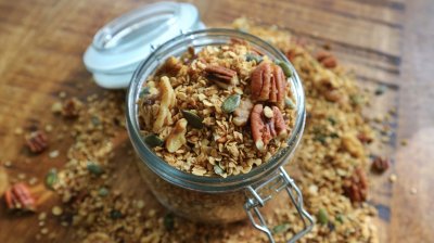 Verwarm de oven voor op 180 graden. Hak de pecan- en walnoten grof (of gewoon lekker makkelijk breken). Meng daarna in een grote kom alle ingrediënten door elkaar. Bekleed een bakplaat met bakpapier en spreid het mengsel over de bakplaat uit. Bak de granola ongeveer 40 minuten in de oven. Elke 10 minuten even door husselen zodat alles gelijkmatig bakt. Houdt het goed in de gaten, elke oven is anders en granola kan snel verkleuren. Na het bakken goed af laten koelen. In een afgesloten pot kun je de granola ongeveer een maand bewaren.