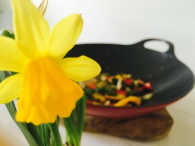 Was en snijd de groente in stevige stukken. Verhit een wok, als deze heet is, een scheut olijfolie erin doen en heet laten worden. De groente en knoflook hierin enkele minuten roerbakken. Wijn, zout en laurierblad toevoegen en in nog een paar minuten beetgaar laten worden. Bestrooien met peper, peterselie en bieslook. Serveer met een stukje zalm of witvis.