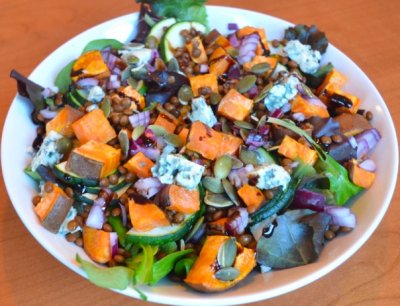 Verwarm de oven voor op 200 graden. Snijd de (ongeschilde) zoete aardappel in blokjes en spreid uit over een bakplaat met bakpapier. Besprenkel met olijfolie en zet in de voorverwarmde oven voor ca. 15 minuten. Draai na 15 minuten de zoete aardappel om en zet vervolgens terug de oven in voor nog eens 15 minuten. Snijd intussen de courgette in gewenste grootte en gril deze in een gril pan. Laat de linzen uitlekken (niet wassen) en vermeng vervolgens met de sla en rode ui. Verkruimel hierboven de kaas.