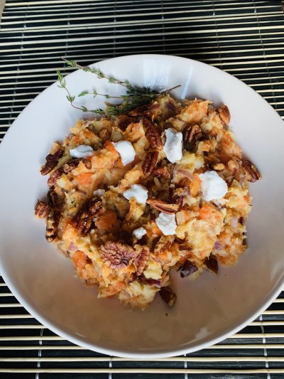 Schil de penen en partinaken en snijd in blokjes. Kook ze gaar in ongeveer 10 minuten, in een klein laagje water met een laurierblaadje en een klein bouillonblokje. Schil en halveer de uien en snijd er dunne ringen van. Schil en snijd de knoflook fijn. Haal de thijmblaadjes van de takjes. Verhit een koekenpan en doe daar de olijfolie in. Bak de uien ongeveer 5 minuten. Voeg de lepel boter met de fijn gehakte knoflook en de verse tijmblaadjes toe. Laat de boter smelten en bak nog een paar minuutjes mee. Giet de peen/ partinaak af (bewaar het kookvocht om de hutspot smeuig mee te maken). Stamp de peen en partinaak fijn. Roer de gebakken ui en geitenkaas erdoor heen. Serveer met een handje (gebroken) pecannoten.