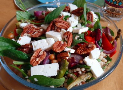 Maaltijdsalade van parelcouscous, zoete aardappel, feta en groene asperges