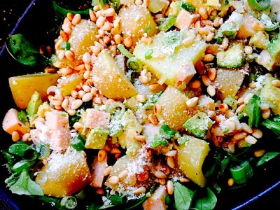 Maak de aardappelen schoon en snijd ze in blokjes. Kook ze vervolgens - in ongeveer 10-12 minuten – beetgaar. Laat ze afkoelen of spoel ze af met koud water om nagaren te voorkomen. Rooster ondertussen de pijnboompitjes. Snij de avocado, gerookte kip en lente-uitjes in stukjes en meng de afgekoelde aardappelen samen met olijfolie en wat peper en zout erdoor. Schep als laatste de veldsla erdoor, eventueel met nog een beetje olijfolie. Bestrooi de salade met de parmezaanse kaas en pijnboompitten.