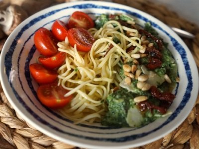Makkelijke pasta met romige spinaziesaus, zongedroogde tomaten en pijnboompitjes