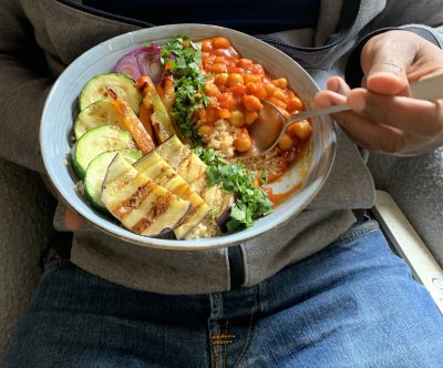 Snijd de ui in ringen en de knoflook in kleine stukjes. Doe de kikkererwten in een vergiet en spoel ze af met koud water totdat ze niet meer schuimen. Verhit een pan en doe er 2 eetlepels olijfolie in. Bak de ui en knoflook enkele minuten. Doe de tomatenpuree en de specerijen erbij en bak even mee. Doe nu de tomatensaus en de kikkererwten erbij en laat nog even kort pruttelen, zet het vuur dan af en laat staan met de deksel op de pan. Bereid de couscous volgens gebruiksaanwijzing op de verpakking. Schil de paprika en snijd in vieren. Was en snijd de aubergine en de courgette in dikke plakken, bestrooi ze met zout en laat 10 minuutjes staan. Verhit de grill(pan) (zorg dat deze goed heet is!). Bestrijk de paprika met wat olijfolie en grill deze als eerste (ongeveer 6 minuten in de grillpan: 3 minuten per kant en de helft van de tijd als je een contactgrill gebruikt). Dep na 10 minuten de aubergine en de courgette droog aan beide kanten en grill alle plakjes groente in 6 minuten in de grillpan. Snijd de groene kruiden (munt, koriander, peterselie) fijn en leg apart. Snijd na het grillen de aubergine en paprika in dunne reepjes. Schep de couscous in schalen of diepe borden, beleg ongeveer de helft met de kikkererwten-tomatensaus. Leg nu de gegrilde groenten en de kruiden erop. Klaar is je supergezonde vegan budha bowl!