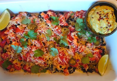 Verwarm de oven op 200 graden. Schil en snijd de zoete aardappelen in schijfjes. Hussel deze door de olijfolie, leg ze op een bakplaat en bak ze voor 20-25 minuten. Snijd intussen de tomaten en rode ui in blokjes en doe samen met een teentje knoflook in een kom. Hussel samen met 1 eetlepel olijfolie, het sap van een halve citroen en een snuf peper en zout door elkaar. Laat de zwarte bonen uitlekken in een vergiet. Wanneer de zoete aardappel knapperig is (naar ca. 20-25 min) haal je de bakplaat uit de oven en verdeel je de zoete aardappel in een ovenschaal. Hierover verdeel je de zwarte bonen, het tomatenmengsel, de kaas en jalapenos pepers (naar wens). Zet in de oven voor ca. 10-15 minuten. Maak intussen de guacemole. Snijd de ui en tomaat in stukjes. Meng de avocado, tomaat, rode ui en chilipeper in een kom en pureer met de staafmixer. Breng op smaak met peper en zout naar wens. Schep de guacemole in een mooi schaaltje ter garnering van de ‘nacho’s’. Haal de ovenschaal uit de oven en garneer het geheel met de guacemole, koriander en limoen.