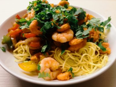 Doe de noodles in een diep bord, schep de groente erop en vervolgens de garnalen. Garneren met de koriander.