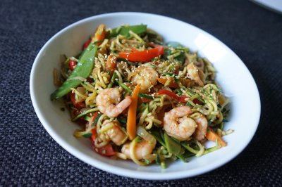 Oosterse courgettenoodles met grote garnalen, verse gember en geroosterd sesamzaad