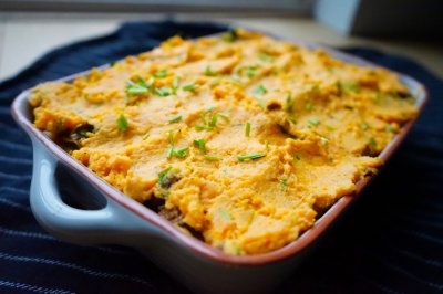 Ovenschotel zoete aardappel, gehakt, prei, kool