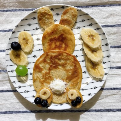 Meng alle droge ingrediënten en meng goed. Scheid de eieren in eiwit en eigeel. Klop de eiwitten stijf en luchtig. Voeg de melk toe. Smelt bakvet in een pan en laat afkoelen. Klop hierna het eigeel tot het gemengd is. Meng langzaam de eiwitten met het eigeel totdat het volledig gemengd is. Voeg het afgekoelde bakvet toe. Roer weer langzaam het bloemmengsel door het eimengsel tot het gemengd is. Probeer te voorkomen dat er klontjes vormen. Verhit bakvet in een koekenpan op middelhoog vuur. Meet het beslag met een lepel af in de pan. Gebruik voor de romp een wat groter pannenkoekje en voor de kop een iets kleinere. Draai ze pas om wanneer er zich bubbeltjes gaan vormen en ze bruin worden. Snijd uit 1 of 2 pannenkoekjes de hazenoren. Ten slotte gebruik je 2 kleine pannenkoekjes voor de pootjes. Maak van de pannenkoekjes de paashaasvorm. Gebruik de banaan en blauwe bessen voor de pootjes van de paashaas. Het kokosschaafsel kan tot een staartje gevormd worden. Garneer de pannenkoekjes (eventueel) met wat poedersuiker/stroop. De lente is nu echt begonnen! Eet ze!