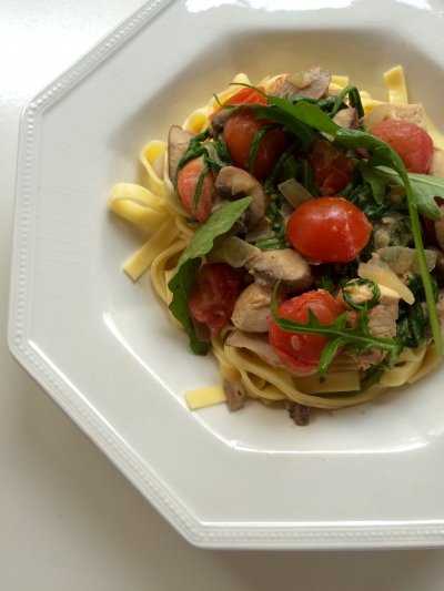 Voeg de cherrytomaatjes en rucola toe, meng dit goed en zet vervolgens het vuur uit.