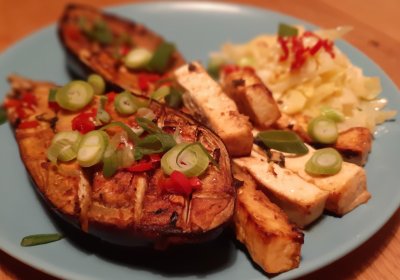 Pittige miso-aubergines met tofu en splitkool