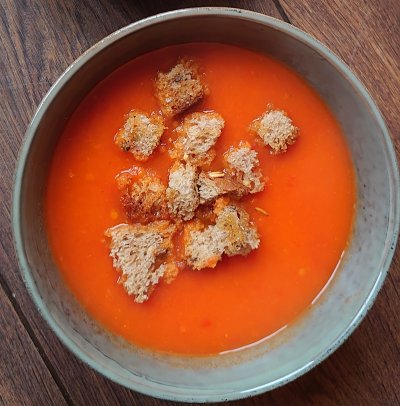 Pittige paprika-tomatensoep met zelfgemaakte croutons