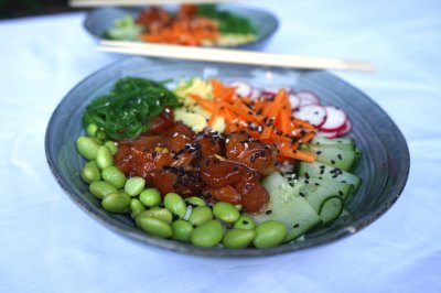 Schil en snijd de gember (zeer) fijn. Maak de marinade door de sojasaus, de sesamolie en de gember met elkaar de vermengen. Snijd de rauwe zalm in kleine blokjes en vermeng deze goed met de marinade. Zet afgedekt in de koelkast voor minimaal een uur. Kook de rijst volgens instructies op de verpakking, giet af en laat rustig afkoelen (lauwwarm opdienen is het lekkerst). Was en snijd de komkommer in hele dunne plakjes (gebruik een mandoline voor het beste resultaat). Schil en snijd de worteltjes julliene (hele dunne reepjes). Was en snijd de radijsjes in dunne plakjes. Leg de groente op een diep bord. Vermeng de rijstazijn met de agavesiroop of honing en giet het mengsel over de gesneden wortel, komkommer en radijs. Dek af en zet weg. Zet een klein pannetje water op en breng aan de kook, kook de sojaboontjes een paar minuten met wat zout en giet ze af. Snijd de avocado in dunne plakjes. Vermeng de mayonaise met de wasabi en een scheutje water. Verdeel de rijst over 2 schalen. Leg hierop de komkommer, radijs, wortel, sojaboontjes, zeewiersalade, avocado en gemarineerde zalm. Schep hier de wasabi-mayo over en bestrooi met wit en zwart sesamzaad.