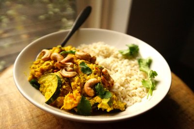 Spoel de linzen af in een zeef tot ze niet meer schuimen en laat uitlekken. Schil en snijd de pompoen in kleine stukjes (indien je een verse pompoen gebruikt). Schil en snijd de ui en knoflook in dunne ringen/ kleine stukjes. Was en snijd de rode peper, als je het gerecht pittig wilt maken, laat dan de zaadjes erin zitten. Wil je een milde smaak? Verwijder de zaadjes dan. Snijd het pepertje in dunne ringetjes. Verhit een hapjes of koekepan met hoge rand. Doe hierin de olijfolie en bak de ui en knoflook enkele minuten, doe nu de komijn, masala en gemalen venkelzaad erbij en bak even mee zodat de smaken (en geuren:) lekker vrij komen. Was en snijd ondertussen de courgette in halve plakjes en verwarm de oven vast voor op 175 graden. Doe de pompoen, rode peper en courgette erbij in de pan en bak mee. Voeg nu de kokosmelk, het bouillonblokje en de linzen toe, breng aan de kook en laat vervolgens lekker pruttelen op een laag vuurtje totdat de groenten en linzen gaar zijn (ca 20 minuten). Vermeng de cashewnoten met wat zout, paprikapoeder, chili en een lepeltje water. Bak deze in 10-12 minuten goudbruin en knapperig in de voorverwarmde oven (af en toe even checken en omscheppen). Serveer de dahl met zilvervliesrijst, de geroosterde cashewnoten en veel verse koriander.