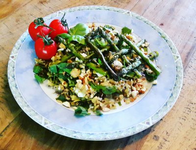 Quinoa, rijst en linzenmengsel met gegrilde asperges en tomaten