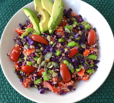 Kook de quinoa volgens de aanwijzingen op het pak en laat hierna afkoelen. Snijd de paprika in blokjes en de snoeptomaten doormidden en doe in een kom. Voeg hier de voorgesneden rode kool en edamame aan toe. Maak de dressing door de sojasaus in een schaaltje te schenken en hierboven een halve limoen uit te knijpen en een stukje gember te raspen. Roer dit geheel goed door. Voeg de afgekoelde quinoa toe aan de kom met paprika, tomaten, rode kool en edamame. Schenk hier de dressing overheen en schep goed door. Serveer de salade op een bord met schijfjes avocado en pompoenpitten.