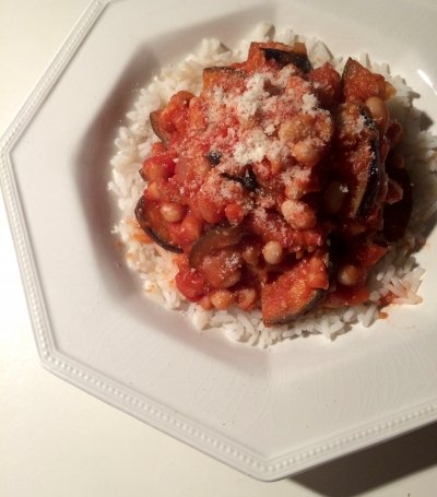 Serveer de rijst met het bonen aubergine mengsel en strooi hier wat Parmezaanse kaas over.