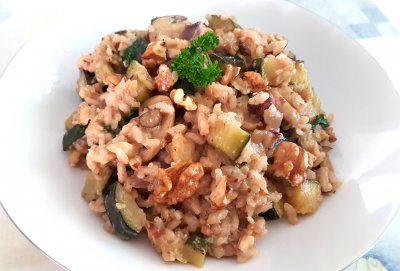 Maak bouillon van het bouillonblokje en kokend water. Snipper de ui, snijd de courgette in blokjes en snijd de paddenstoelen in grote stukken. Verhit de olie in een pan en bak de ui glazig. Pers het teentje knoflook er boven uit. Voeg de courgette en paddenstoelen toe en bak deze ongeveer 2 minuten mee. Doe vervolgens de rijst in de pan en bak deze ook kort mee. Voeg het citroensap toe. Zet het vuur laag en voeg zoveel van de bouillon toe, dat de rijst bedekt is. Voeg iedere keer wanneer de bouillon door de rijst is opgenomen, weer een beetje toe. De risotto is na ongeveer 20 minuten klaar. Breng de risotto eventueel nog op smaak met een beetje zout en peper en roer de noten en peterselie erdoor heen.