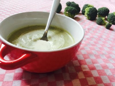 Schil en snipper de ui en de knoflook. Snijd de broccoli in roosjes en was deze. Verhit een pan en doe hier de olie in. Laat heet worden en fruit de ui en de knoflook. Voeg de broccoli, het water de bouillonblokjes en de laurierblaadjes toe. Laat ca 20 minuutjes koken. Voeg eventueel extra water toe. Als alles goed gaar is, haal de laurierblaadjes eruit en mix met staafmixer of in blender. Voeg en scheutje room toe en bestrooi met zwarte peper.