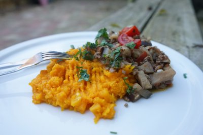 Romige pompoenpuree met kruidig aubergine-gehakt