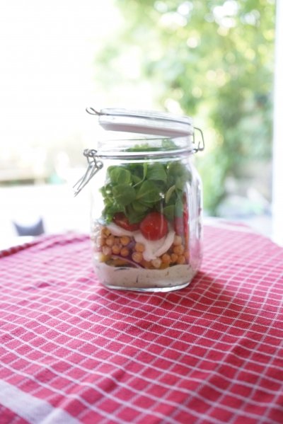 Doe de dressing (2 eetlepels) onderin de weckpot. Doe vervolgens de hardere groente; ui, komkommer en paprika erbij. Daarna een laagje geroosterde kikkererwten, dan de mozzarella, dan de tomaatjes en tenslotte dek je het geheel af met de veldsla. Voor gebruik even schudden: lekker!