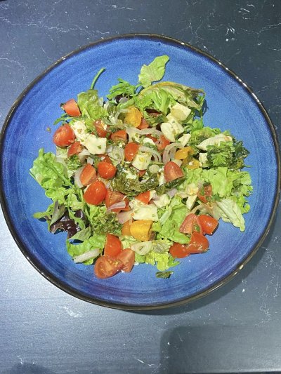 Maak eerste de dessing: snipper de sjalot, hak de knoflook en hak de basilicum en peterselie. Meng met de olijfolie, citroensap en een snuf peper en zout. Maak nu de salade: snijd de mozzarella in stukjes en de (gewassen) tomaatjes in helften. Voeg toe aan de sla en meng met de dressing. Bon appetit.