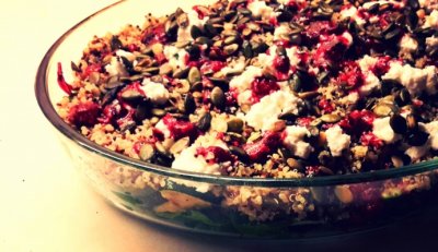 Salade met quinoa en warme geitenkaas met balsamico-frambozendressing