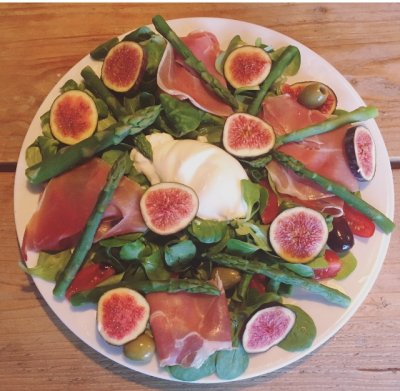 Verdeel de sla over 2 borden en verspreid de tomaatjes, vijgen, groene aspergepuntjes, ham en olijven verspreid overheen. Halveer de burrata en leg op beide borden een halve bol in het midden. Maak de salade af met 2 eetlepels balsamico azijn verdeeld over de salades.