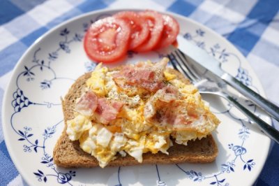 Scrambled egg met gebakken ham en dille op volkorentoast (ontbijt)