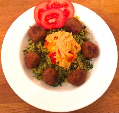 Snelle bloemkoolrijst met vegetarische balletjes en pittige hummus