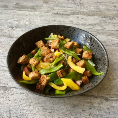 Marineer de tempeh in een fijngesneden knoflookteentje, olie, rode wijnazijn, Italiaanse kruiden (rozemarijn, oregano en tijm). Snijd de 2 boterhammen in croutonvorm en leg deze in een schaal. Voeg hieraan 1 eetlepel olie, 2 theelepels paprikapoeder, peper, zout en 2 theelepels tijm toe. Bak dit in ongeveer 5 - 7 minuutjes krokant op middelhoog vuur. Verwijder ondertussen de topjes van de snijbonen en snijd ze in 3 stukken. Kook deze 3 minuten. Spoel de snijbonen hierna kort af onder de koude kraan. Bak de tempeh in 5 min krokant op middelhoog vuur. Snijd de rode ui en gele paprika in redelijk grove stukken. Snijd de perzik in grove stukjes. Voeg alles bij elkaar en gebruik als dressing de balsamicoazijn en extra vierge olijfolie.