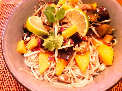 Sobanoodles met mango, aubergine en champignons