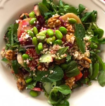Breng een pan met water aan de kook. Spoel de quinoa goed af. Voeg de quinoa toe aan het kokende water en laat het ongeveer 10-12 minuten koken. Laat de quinoa op een laag vuurtje staan met de deksel op de pan. Haal de pan met gekookte quinoa van het vuur en laat het vijf minuten rusten. Roer de quinoa goed door en giet vervolgens af. Kook de ongeschilde, ongesneden biet zo’n 20-30 minuten (afhankelijk van de soort biet). Prik tijdens het koken regelmatig met een vork in de biet om te testen of die al gaar is. Snijd ondertussen de komkommer, tomaatjes, peer en rode ui in stukjes en kook de soja bonen in water zo’n 2-4 minuten. Laat de bonen schrikken door ze in (ijs)koud water te doen. Pel na het koken van de bietjes de schil er af en snijd ze in plakjes, reepjes of blokjes (bij minder tijd: Neem voorgekookte bietjes uit de verpakking en snijdt deze in stukjes). Alle ingrediënten zijn nu klaar om op het bord geserveerd te worden. Begin met een laagje quinoa op het bord, doe hier de bietjes bovenop en vervolgens de twee soorten sla. Voeg komkommer, tomaat, sojabonen, peer, walnoten en de rode ui hier aan toe. Als Finishing Touch een paar blaadjes verse munt om het gerechtje af te maken. De dressing maak je door de olie, honing en mosterd in een kommetje door elkaar te kloppen met een garde, tot vinaigrette. Breng op smaak met peper en eventueel zout.