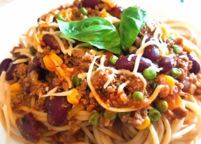 Schil en snijd de ui en knoflook. Was en snijd de tomaat in blokjes. Verwarm een koeken- of hapjespan op een laag vuurtje. Voeg je een eetlepel zonnenbloemolie of een scheutje olie toe. Voeg de gesneden knoflook en ui toe en roer deze met een houten lepel om. Wanneer de ui een beetje bruin wordt kun je de gesneden tomaat toevoegen en 1 minuut laten meebakken. Voeg het rundergehakt toe en bak deze goed gaar. Voeg de gesneden basilicum toe en doe wat zout, peper en chilivlokken bij voor de smaak .Daarna de paprika/tomatenpuree aan het gehakt toevoegen en deze goed mengen. Als laatste de chilibonen en de groentenmix toevoegen en nog 5 minuten op een laag vuurtje laten koken. Serveer met volkorenpasta. En voeg naar smaak geraspte kaas toe en extra basilicum toe.