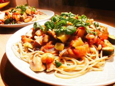 Snipper de uien, snijd/pers de knoflook fijn en snijd de aubergine in blokjes ter grootte van een dobbelsteen. Zet een wokpan op het vuur met de olie, voeg de gesneden groenten toe en laat ongeveer 3 minuten glazig worden. Snijd ondertussen de (gewassen) courgette en (schoongemaakte) champignons en voeg ook deze toe aan de wokpan. Laat het geheel zo’n 8 minuten bakken, terwijl je met een spatel de groenten blijft keren. Nu kun je de tomatensaus, olijven, zongedroogde tomaten en kappertjes toevoegen. Houdt je van ansjovis, snijd deze dan in kleine stukjes en doe het ook in de wokpan. Doe dan de tomatensaus erbij en laat 10 minuten pruttelen. Roer het 2 keer om tijdens deze 10 minuten. Doe ondertussen de spaghetti in kokend water en kook volgens de aanwijzingen op de verpakking. Rooster de pijnboompitten in een koekenpan op laag vuur tot ze lekker geuren of lichtbruin zijn en zet het vuur dan uit. Breng de saus op smaak met peper en serveer samen met de spaghetti op tafel. Garneer met pijnboompitten en verse basilicum.