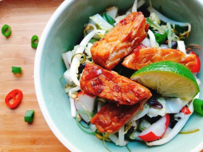 Kook de rijst. Snijd de tempeh in de breedte doormidden. Snijd ze daarna in dunne reepjes. Snijd de ui, knoflook, gember en rode peper in kleine stukjes en bak de ingrediënten 5 minuten in de olijfolie in een hete koekenpan. Voeg dan de sojasus en de honing toe. Bak nog 10 minuten tot het licht knapperig is. Draai het vuur uit als het klaar is. Snijd de witte kool in reepjes en spoel onder de kraan. Laat goed uitlekken en doe dit in een grote (salade) kom. Was de radijs, vierendeel ze en voeg ze toe aan de kom. Spoel de zwarte bonen in een een zeef onder de kraan. Laat ook deze uitlekken en voeg ze toe aan de kom. Maak nu een dressing door alle ingrediënten in een schaaltje door elkaar te roeren met een lepeltje. Meng dit door de salade heen. Was dan de lente ui en snijd in ringetjes. Gebruik deze om het gerecht te garneren.