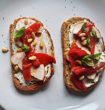 Bak allereerst de pijnboombitten in een koekenpan, zonder olie, tot ze goudbruin zijn. Rooster de boterhammen tot ze goed krokant zijn en besmeer met een laagje zuivelspread. Beleg met plakjes kipfilet en vervolgens met de stukjes puntpaprika. Maak af met de pijnboompitten, blaadjes basilicum en versgemalen peper. Een makkelijke en lekkere lunch!