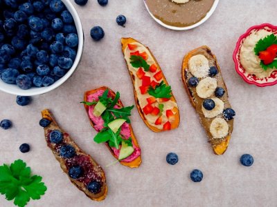 hummus met paprika/ komkommer/ rucola, tahin/ pindakaas met banaan/ blauwe bessen/ jam/ kokos