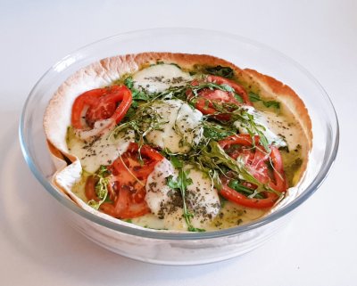 Verwarm de oven voor op 175 graden. Snijd de bol mozzarella in plakjes. Leg een volkoren wrap op een ovenbestendig schaal en besmeer met een eetlepel pestosaus. Verdeel zo’n 4-5 plakkes mozzarella over de wrap. Was de spinazie, tomaten en rucola en snijd de tomaten in dunne grote plakken. Verdeel een handje spinazie en een paar plakjes tomaten over de wrap en herhaal deze stap twee keer. Doe er een beetje peper op en oregano kruiden. Doe de taart in de oven en voeg na zo’n 8 minuten de rucola toe. Laat nog 2-3 minuten in de oven bakken.