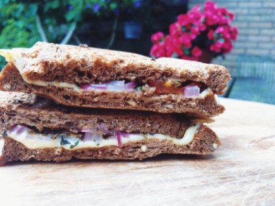 Leg de andere boterham erop en snijd doormidden.
