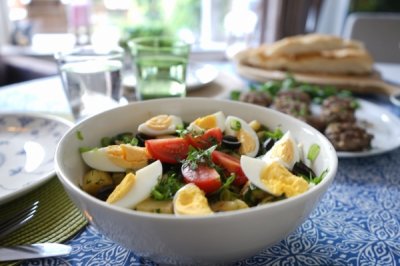 Breng een pan met water aan de kook. Schil de aardappelen leg deze ongeveer 10 a 15 minuten in het kokende water. Kook intussen de eieren hard. Hak de munt, dille en peterselie fijn. Was de komkommer en halveer deze in de lengte, verwijder met een lepel de zaadlijsten en snijd de komkommer in kleine stukjes. Was en snijd de tomaten en verwijder ook hieruit het vocht en de zaden. Snijd in kleine stukjes. Was en snijd de bosui in dunne ringetjes. Was de peper, verwijder de zaadlijsten en snijd hem in kleine stukjes. Vermeng de olijfolie met de granaatappelsaus, de komijn, pul biber, de knoflook en het zout in een kommetje. Giet de gare aardappelen af en snijd deze in kleine stukjes, laat ze afkoelen. Vermeng de afgekoelde aardappelen met de dressing, de verse kruiden en de rest van de groenten. Garneer met de eieren in partjes en de olijven.
