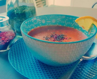 Verwarm de soeppan op een vuurtje en doe er een eetlepel olie bij. Bak de gesneden ui en knoflook lichtbruin. Doe de linzen in de pan en bak deze 1 minuut samen met de ui en knoflook. Voeg 1200 ml water toe met een 1 blokje groentenbouillon en een eetlepel rode pepervlokken. Goed roeren en doe de gesneden aardappel, paprika en wortel in de pan. Laat het ongeveer een haf uur koken op een laag vuurtje met de deksel er op, ga wel een paar keer tussendoor goed roeren. Wanneer de soep bijna klaar is verwarm je de roomboter in een andere pan (steelpan). Doe er een eetlepel paprikapuree bij en een eetlepel fijn gesneden gedroogde munt, deze goed mengen. Voeg dit mengsel toe in de soep en laat het nog 2 minuten koken op een laag vuurtje, goed roeren. Strooi een snufje zout en peper voor de smaak. Laat de soep even afkoelen en pureer de soep tot een glad mengsel met een staafmixer. Je kunt ook een keukenmachine gebruiken. Serveer de soep met een schijfje citroen.