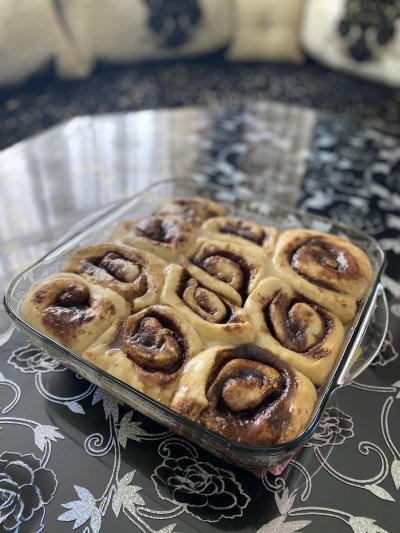 Verwarm de oven voor op 180 graden. Rol het deeg tot een rechthoek op een met bloem bestoven tafel. Mix de boter met de bruine suiker en de kaneel. Verdeel de het mengsel gelijkmatig over het deeg. Rol het deeg op tot het eind en snijd doormidden. Snijd beide helften in 6 gelijke stukken van ongeveer 6 cm dik. Plaats de rolls in een ingevette bakvorm en dek af en laat 30 minuten op een warme plaats rijzen. Bak de rolls in een voorverwarmde oven op 180°C voor 25-30 minuten, tot ze goudbruin zijn. Besprenkel, terwijl het nog warm is, gelijkmatig met glazuur.