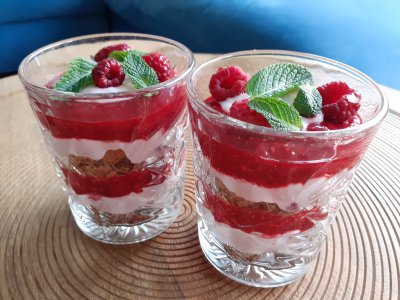 Pak een mengkom en klop met een garde de yoghurt door de mascarpone tot een glad mengsel. Meng vervolgens de jam erdoorheen. Doe de frambozen in een maatbeker en pureer de frambozen met een staafmixer. Verbrokkel de koekjes en deel op in vier hoopjes koekkruimels. Pak 2 glazen en vul elk glas met een deel koekkruimels. Schep daarop een paar lepels roomyoghurt en daarop een paar lepels frambozen puree. Vervolgens maak je nog eenzelfde laag. Een deel koekkruimels, een paar lepels roomyoghurt en een paar lepels frambozen puree. Doe de overgebleven roomyoghurt on top. Zet de glazen minimaal 30 minuten in de koelkast.