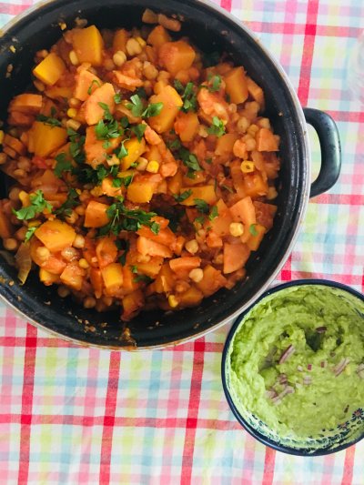 Schil en snijd de pompoen en zoete aardappel in blokjes (van ca.1 cm). Schil en snijd de ui en knoflook in dunne ringen/ kleine stukjes. Verhit een hapjespan of braadpan. Doe hier de olijfolie in en bak de ui en knoflook aan, doe de gedroogde kruiden erbij en bak mee. Doe vervolgens de gesneden pompoen en zoete aardappel erbij. Bak en roer ongeveer 5 minuten. Doe vervolgens de tomatenpuree erbij en roer goed om. Doe nu gepelde tomaten en de bouillonblokjes erbij. Voeg eventueel een scheutje water toe. Laat het geheel op een zacht vuurtje ongeveer 15 minuten stomen, totdat de zoete aardappel en pompoen goed gaar zijn. Spoel de kikkererwten af in een vergiet met koud water tot ze niet meer schuimen. Voeg de kikkererwten toe en schep de mais erbij. Verwarm alles en haal de pan van de warmtebron. Voeg als laatste de fijngesneden peterselie toe. De guacemole maak je door de (geschilde, ontpitte) avocado's te prakken en te vermengen met het sap van de limoen, het peper en zout en vervolgens de rode ui te snipperen en erdoorheen te roeren.